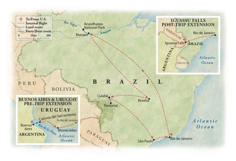 Then, we will fly south to Pantanal, one of the biggest wetlands of the world, where our travel experience continues. In the Pantanal our chances to see wildlife will be considerably higher than in the Amazon, as the wetlands are more open. We might see caimans, capybaras, monkeys, macaws, herons and more. From our lodge we will go horseback riding and take riverboat rides to explore these mighty wetlands.
